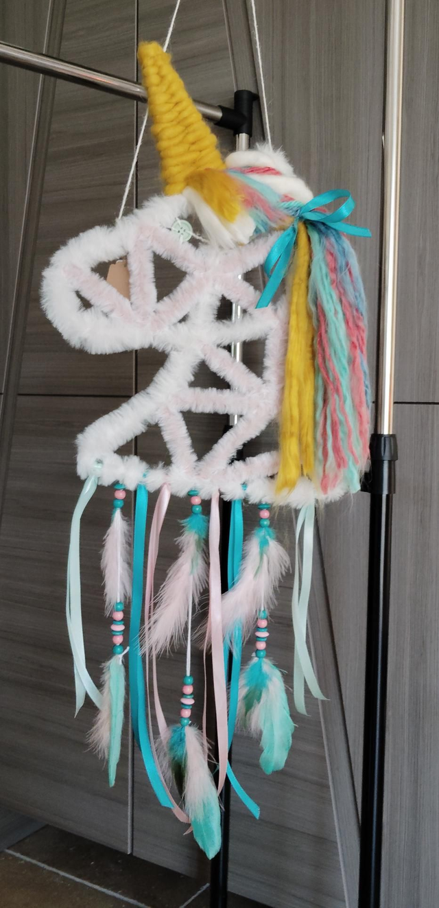 Licorne en métal, perles et bouton en bois, laine polyester, fil coton, plumes marabout et coq, rubans satin